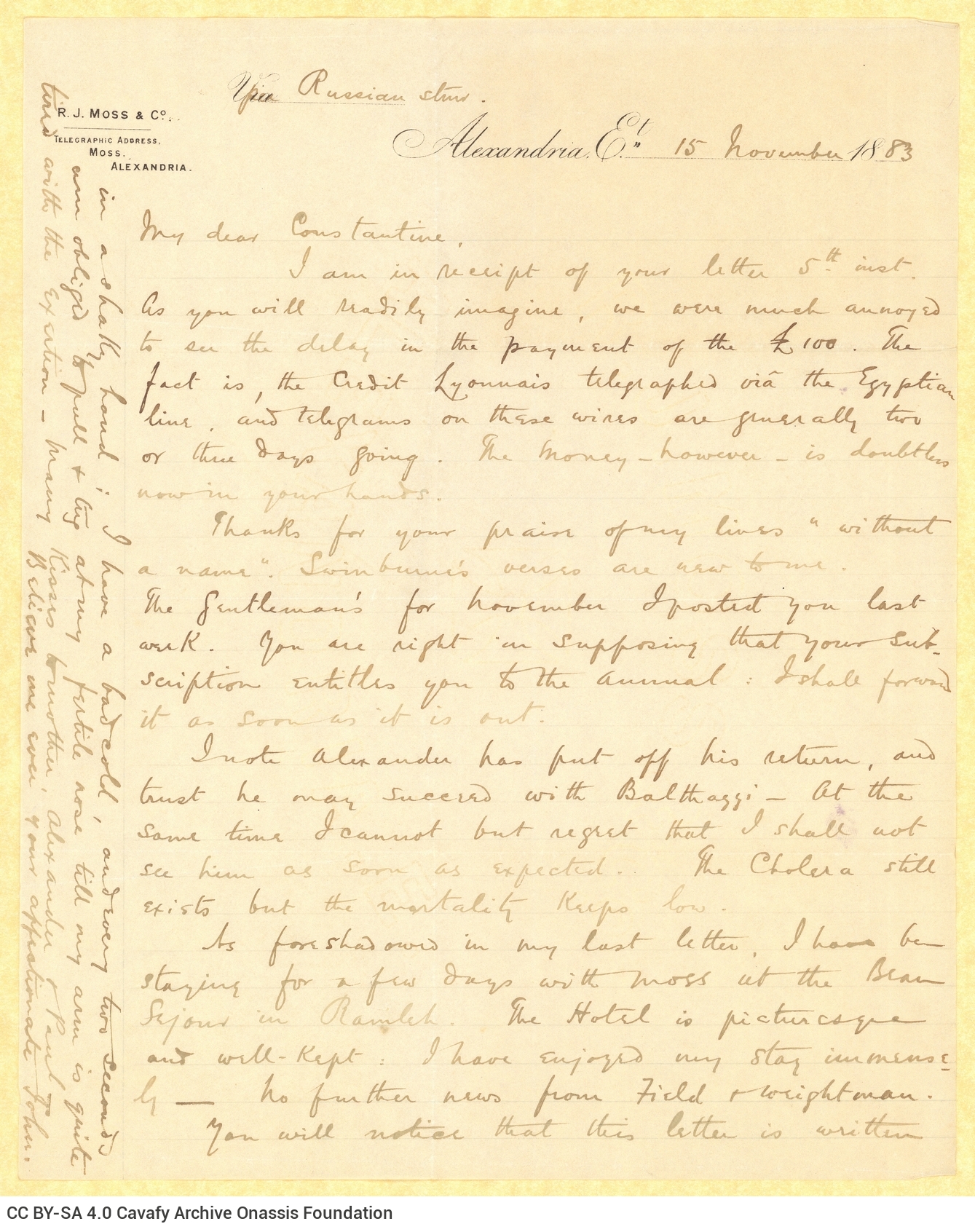 | 0024 (399) | Επιστολή του John Καβάφη προς τον Κ. Π. Καβάφη | Τεκμήριο | 8/5/1883 | ||