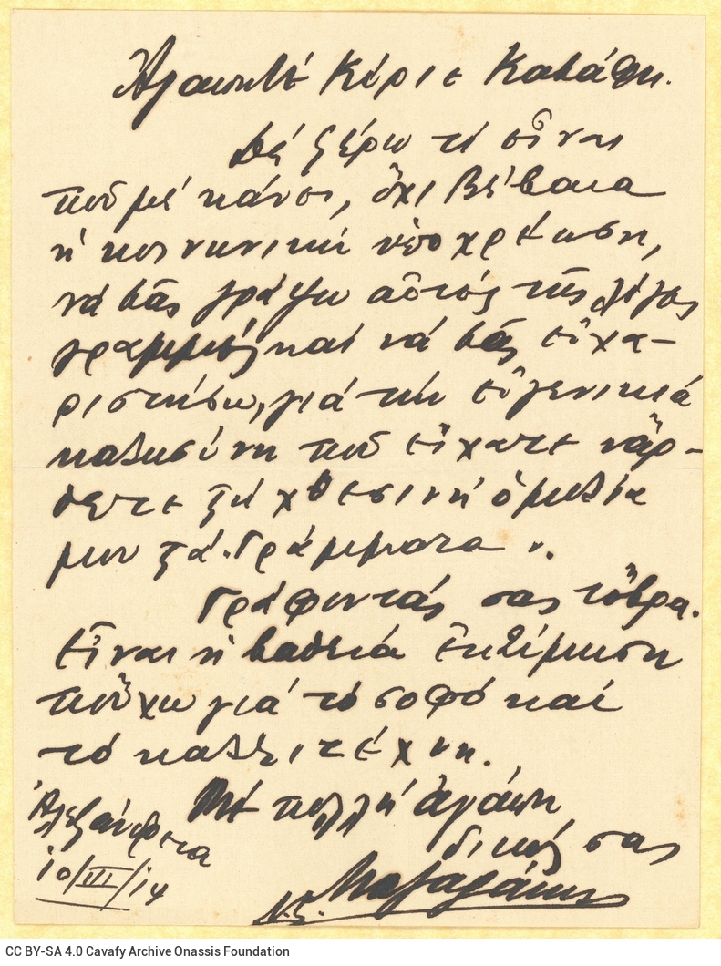 Επιστολή του Μ. Παπανικολάου προς τον Καβάφη
