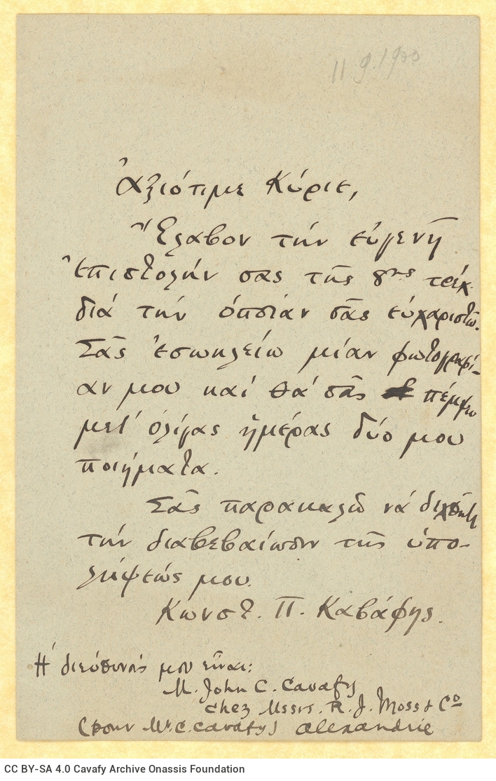 Handwritten copy of a letter by Cavafy to an unknown recipient, in which he informs them about the despatch of a photograph of his and of two of his poems. The date is noted in pencil.