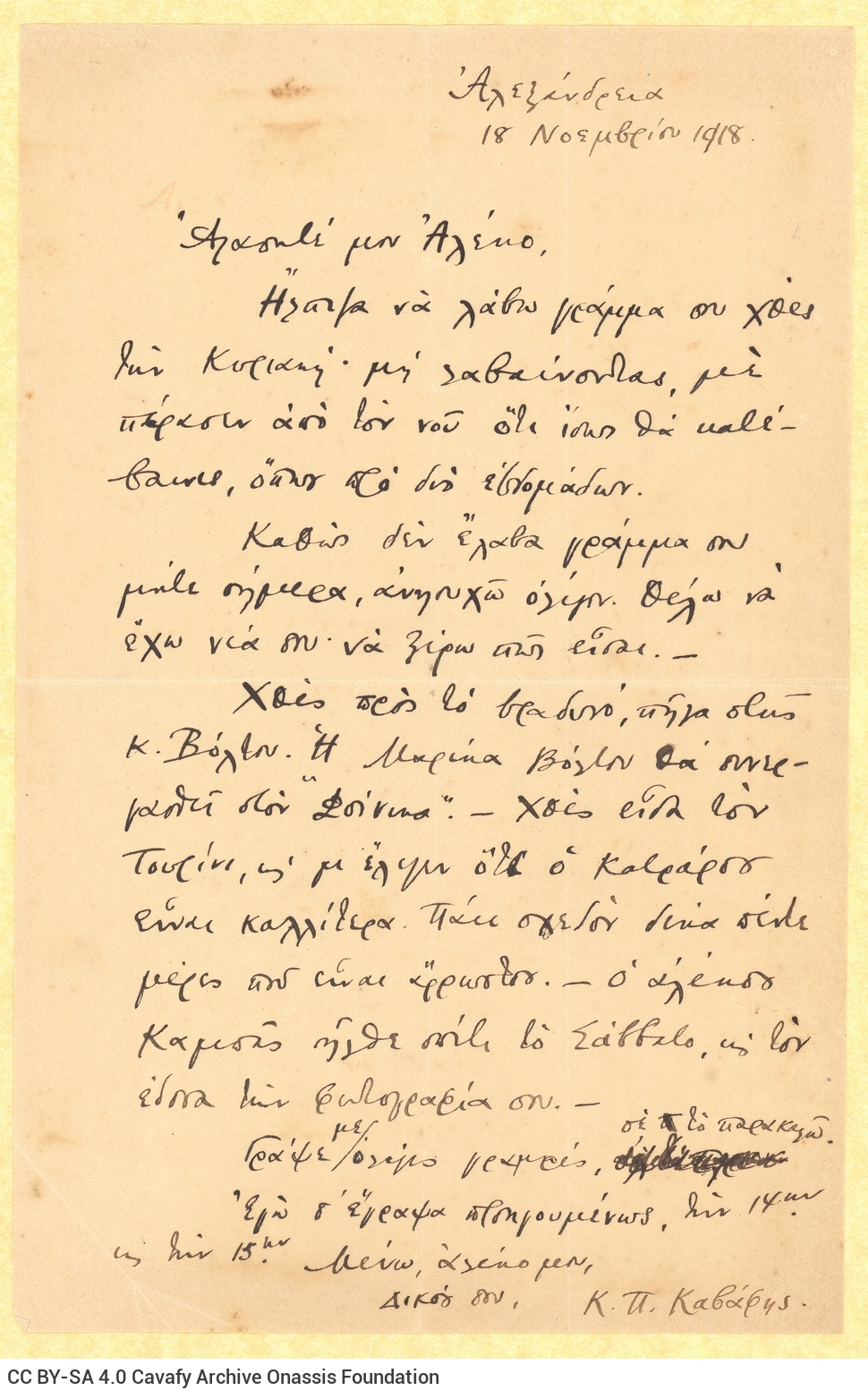 Cavafy, C. P.. “Letter by Cavafy to A. Singopoulo”. Letter, 18.11.1918. GR-OF CA SING-S01-F02-SF001-0019 (1420), Onassis Foundation Alekos & Rica Singopoulo Fonds. From The Digital Collection of the Cavafy Archive, edited by Onassis Foundation, Athens, last modified 01.10.2025. https://doi.org/10.26256/SING-S01-F02-SF001-0019.