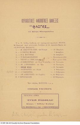 Programme of Sunday lectures by Tefkros Anthias (pen name of Andreas Pavlou), organised by the literary journal Floga, which he directed. The lectures were given in the period 30/11/1924-22/2/1925. One of the lectures is about Cavafy. Handwritten note by the poet in pencil, that the lectures were taking place in Sparta (Anthias was working there as a teacher during the 1924-1925 period). Advertisement of the novel "Thysia anofeli" by Tefkros Anthias below the programme. Handwritten emendation in ink. Blank verso.