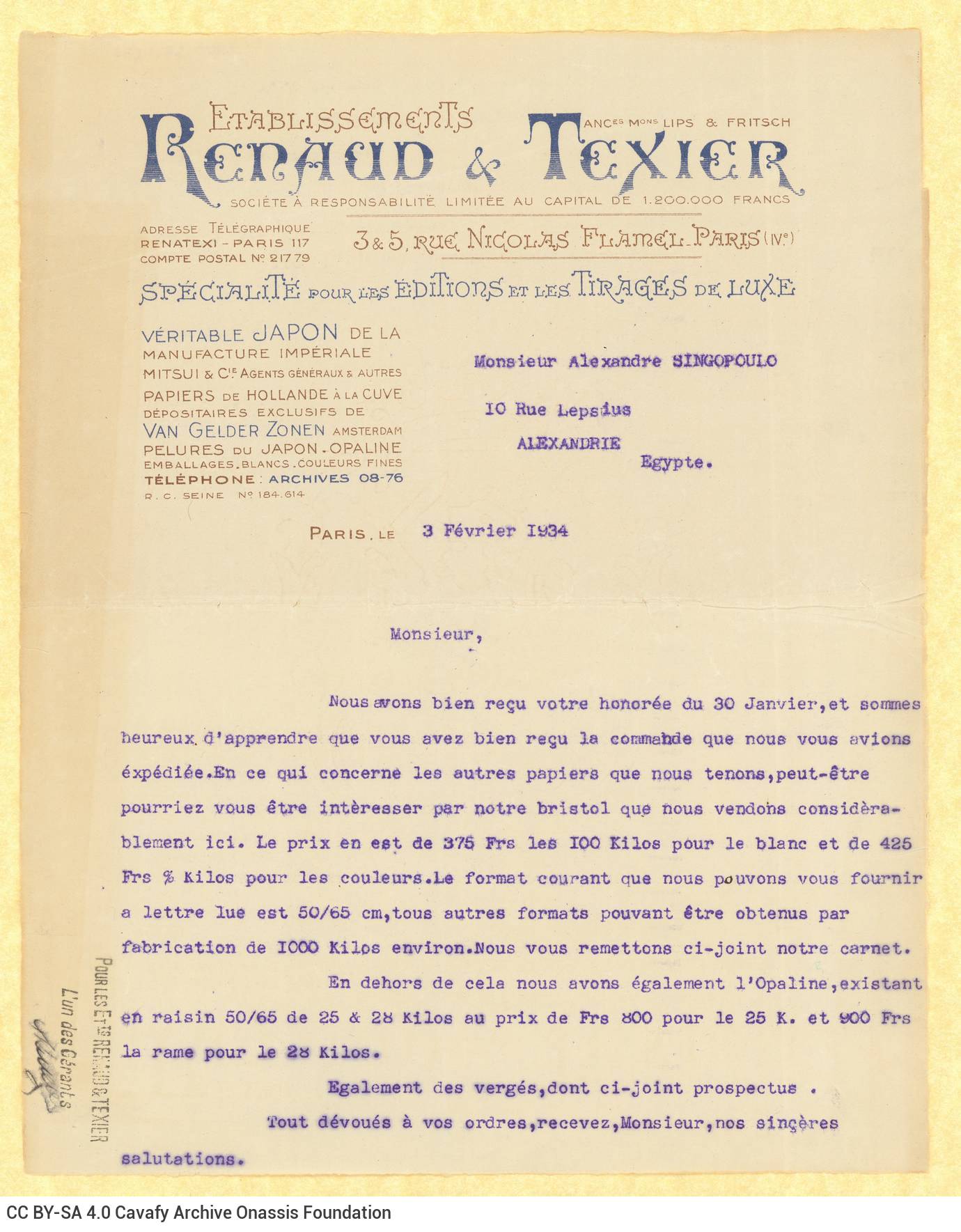 Renaud & Texier. “Letter by the Renaud & Texier company to A. Singopoulo”. Letter, 03.02.1934. GR-OF CA SING-S01-F02-SF002-0016 (1799), Onassis Foundation Alekos & Rica Singopoulo Fonds. From The Digital Collection of the Cavafy Archive, edited by Onassis Foundation, Athens, last modified 01.10.2025. https://doi.org/10.26256/SING-S01-F02-SF002-0016.