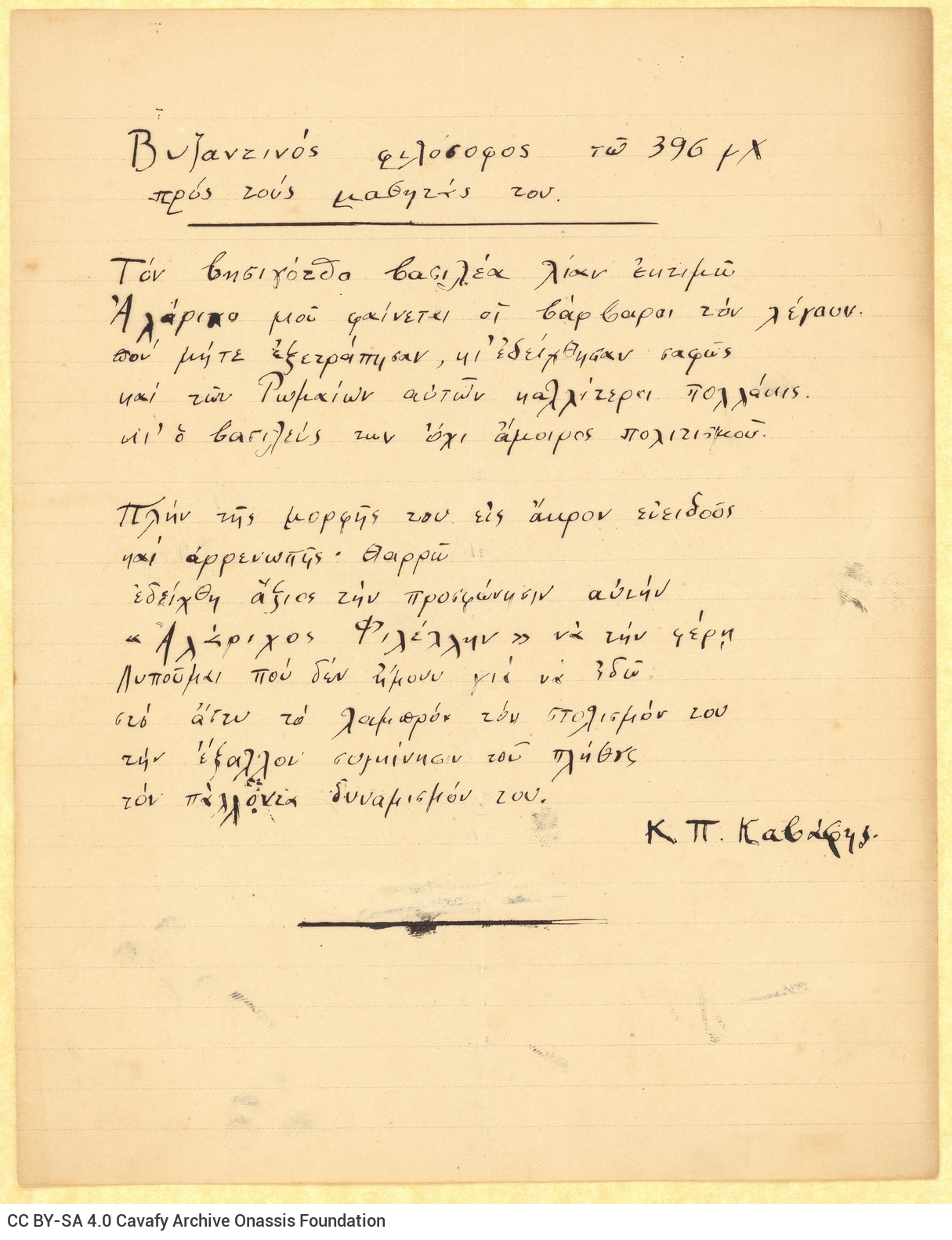 Χειρόγραφο ποίημα («Βυζαντινός φιλόσοφος τω 396 μ.Χ. προς τους μαθητάς του») στο recto διαγραμμισμένου φύλλου. Το verso κενό. Κάτω από το ποίημα το όνομα του ποιητή. Ο γραφικός χαρακτήρας, τόσο του ποιήματος όσο και της υπογραφής, δεν είναι του Καβάφη, αν και διαφαίνεται προσπάθεια μίμησης της γραφής του. Το ποίημα δεν αποτελεί μέρος του έργου του Καβάφη.