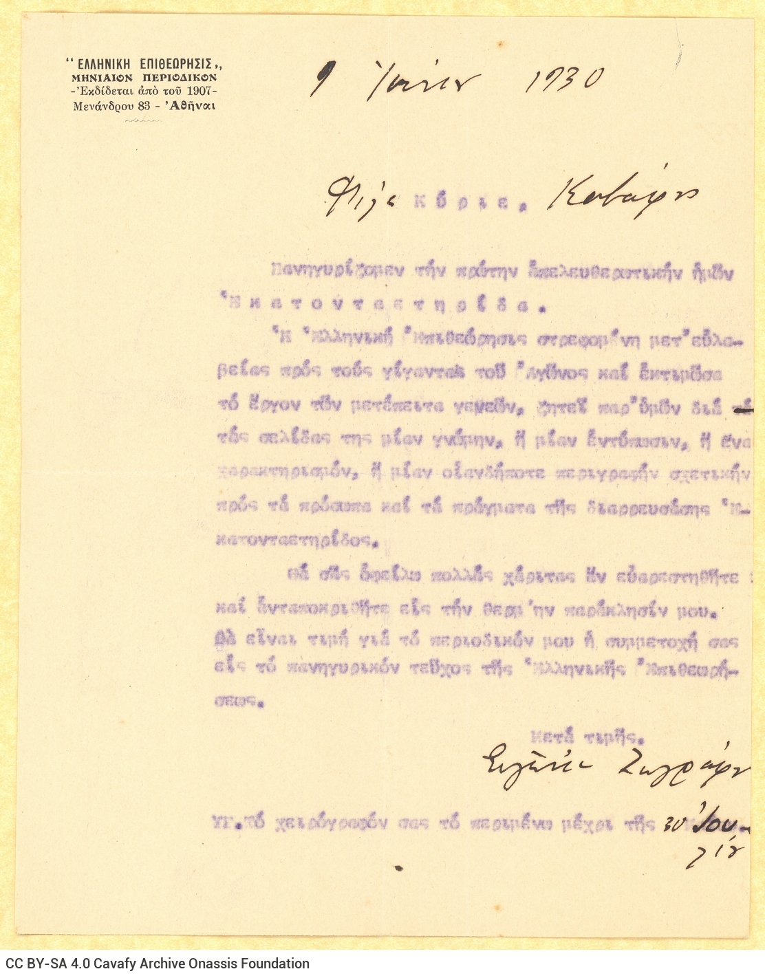 Typewritten letter by Evgenia Zografou to Cavafy on one side of a letterhead of the review Elliniki Epitheorisis, of which she is the director. Blank verso. The date, salutation and signature as well as emendation are handwritten. The poet is asked to participate in a celebratory issue of the review for the centennial of the Greek War of Independence. (Athens)