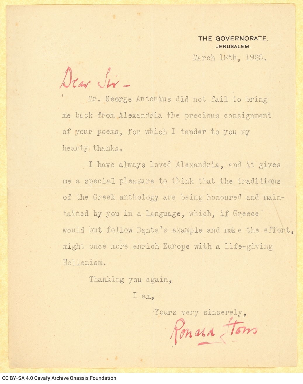 Typewritten letter by Ronald Storrs to Cavafy, on one side of a letterhead ("The Governorate" at top right and embossed British blazon at top left). Blank verso. The salutation and signature handwritten in ink. Thanks for the despatch of poems by Cavafy. (Jerusalem)