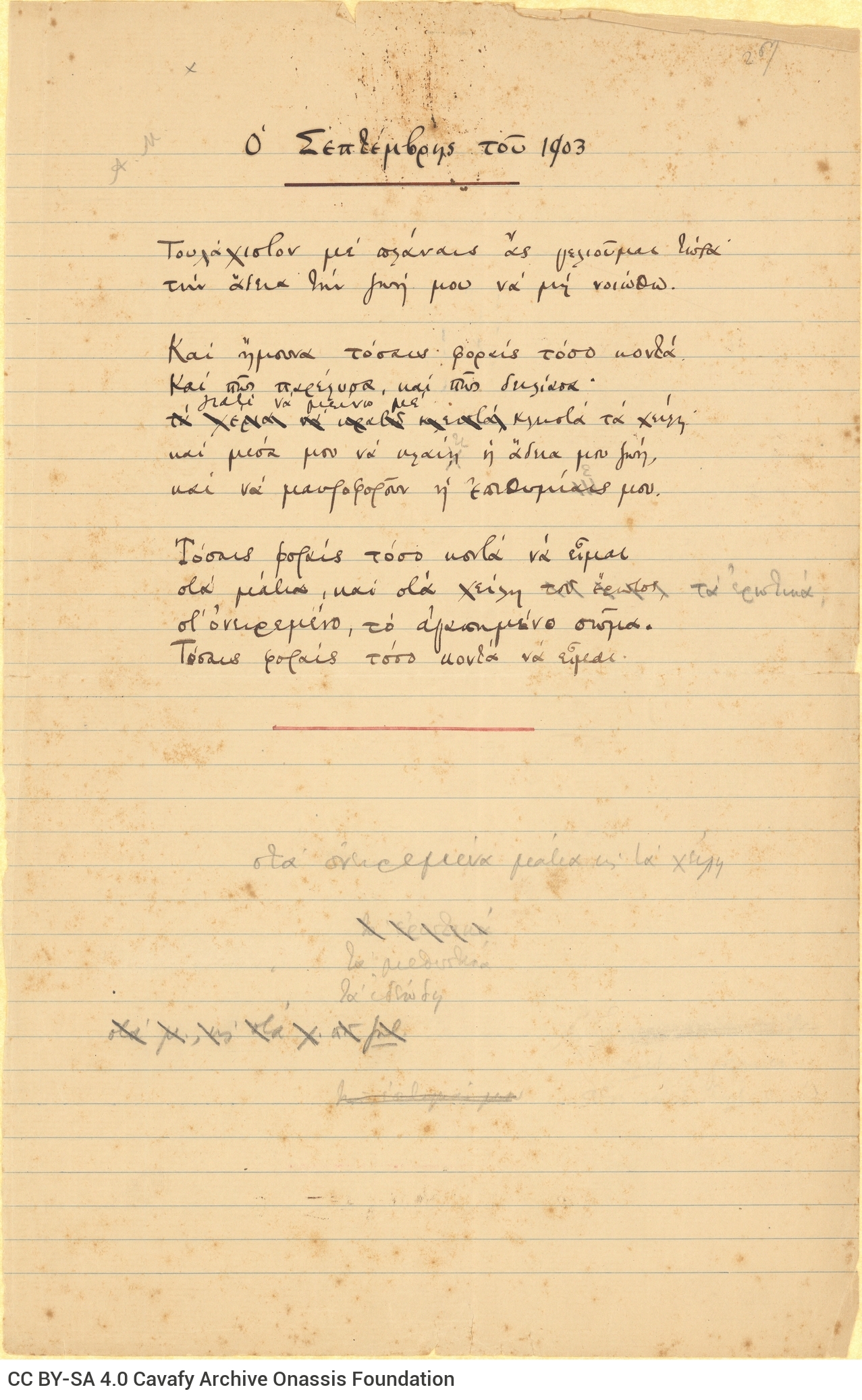 Cavafy, C. P.. “September of 1903”. Poem (manuscript), n.d.. GR-OF CA CA-SF01-S01-F01-SF001-0106 (112), Onassis Foundation C. P. Cavafy Fonds. From The Digital Collection of the Cavafy Archive, edited by Onassis Foundation, Athens, last modified 01.10.2025. https://doi.org/10.26256/CA-SF01-S01-F01-SF001-0106.