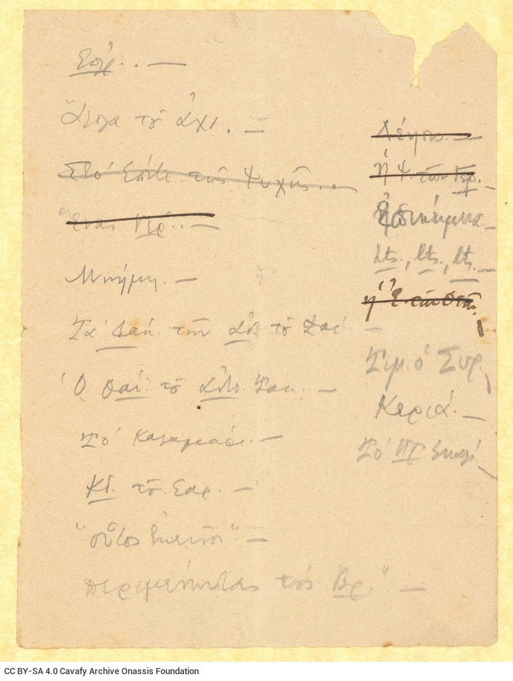 Handwritten abbreviated titles of poems by Cavafy, on one side of a piece of paper. Cancellations. Blank verso.
