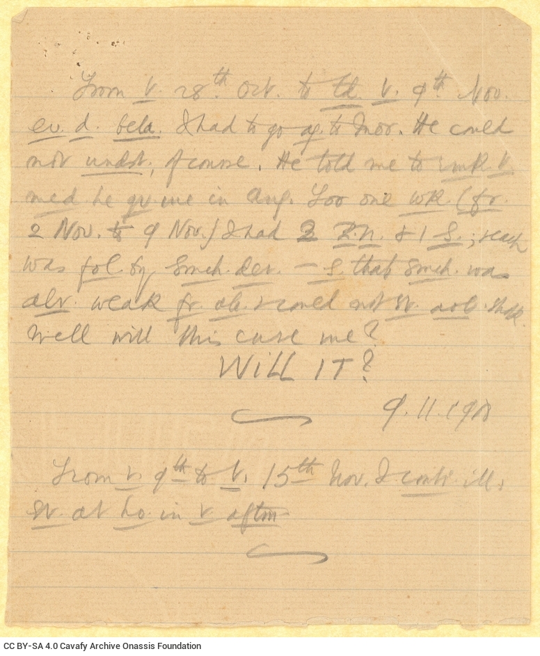 Handwritten notes by Cavafy on one side of a small piece of paper. Extensive use of abbreviations. Blank verso. The note refers to the period October–November 1908 and to a specific person that cannot be identified. The poet wonders whether he will be healed.