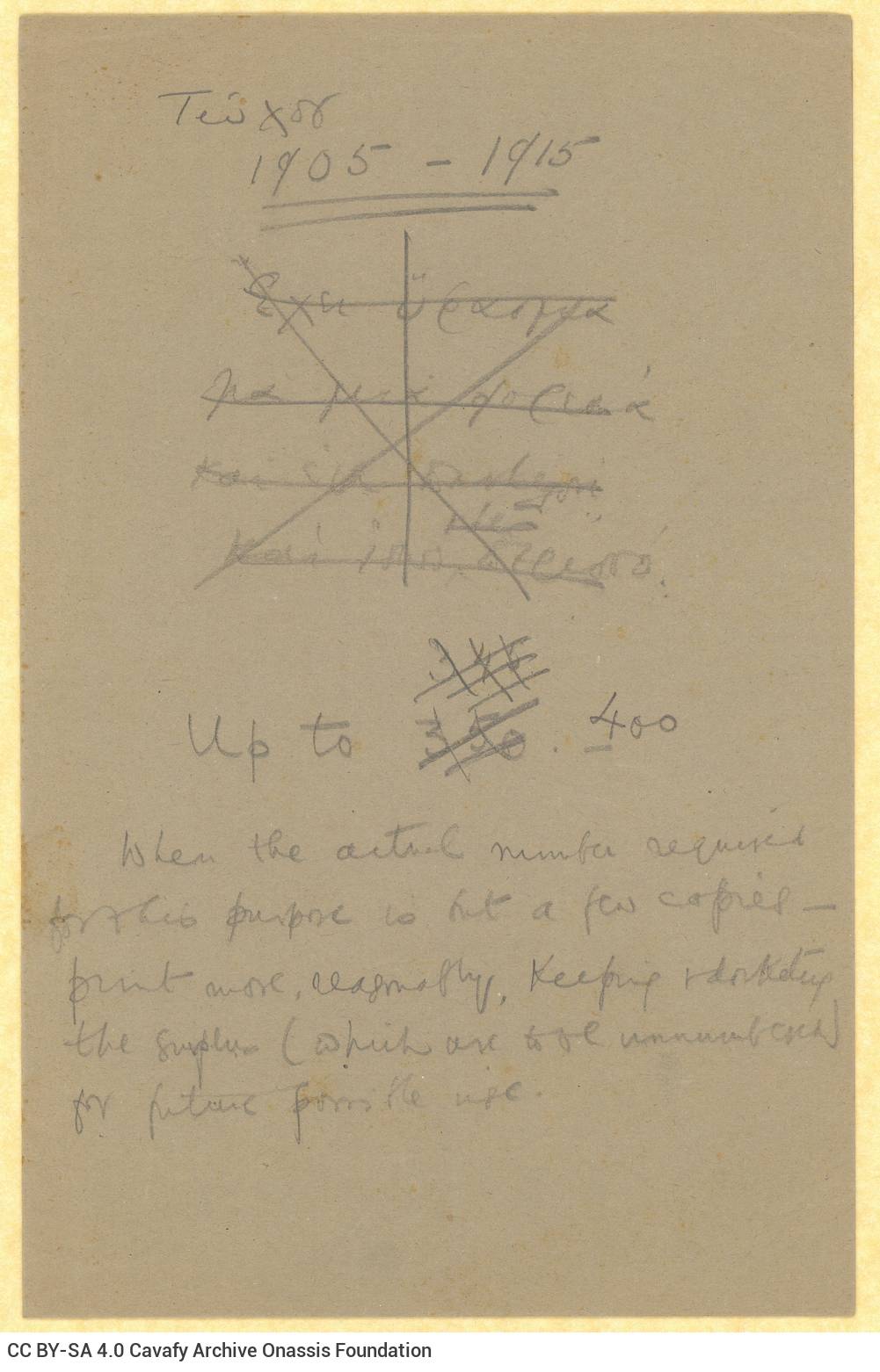 Handwritten notes by Cavafy on the first page of a bifolio made of paperboard. The remaining pages are blank. At the top of the page, the title "Issue 1905-1915"; crossed out verses in Greek below. Instructions in English regarding the number of issues to be printed below the verses.