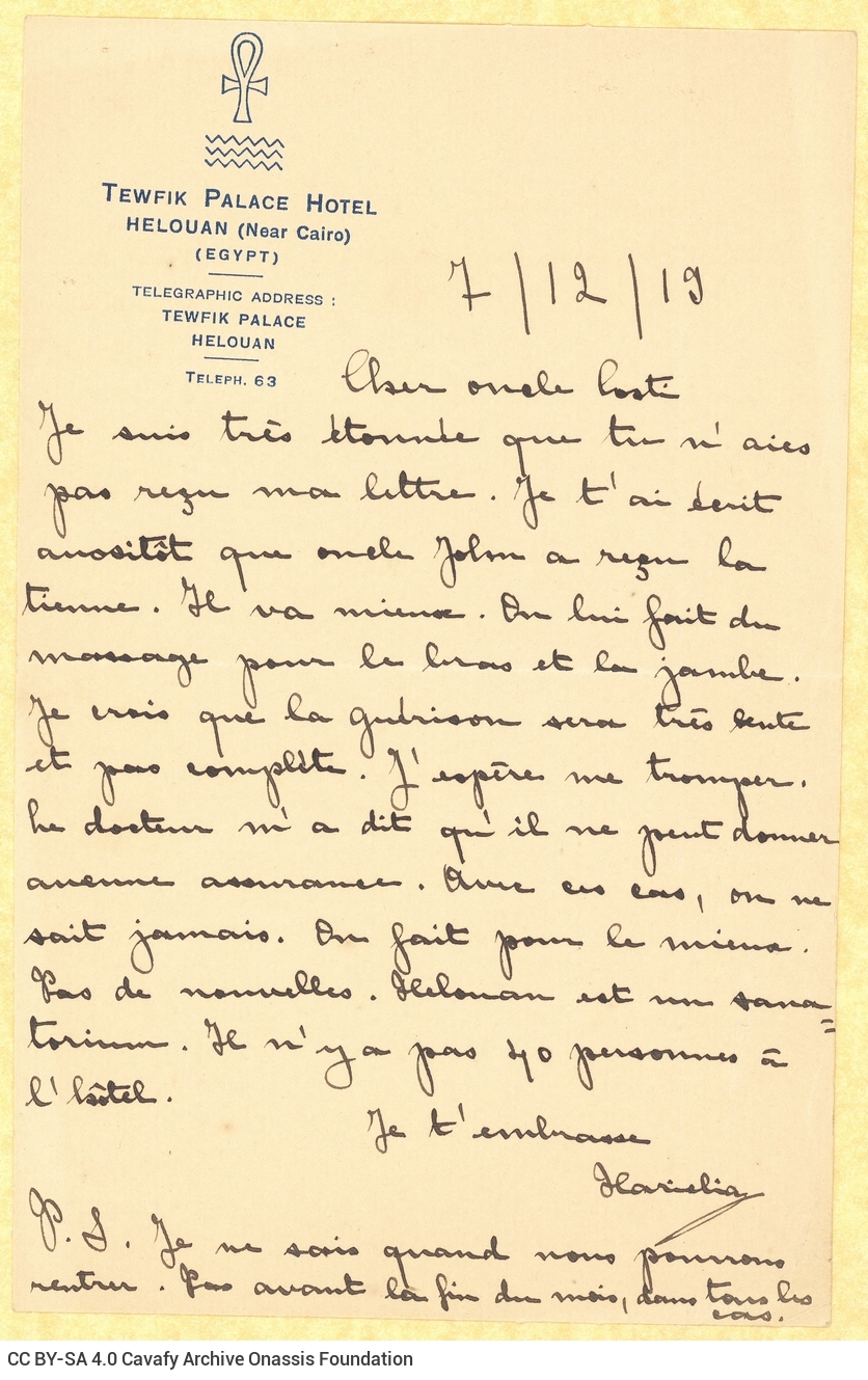 Επιστολή της Χ. Καβάφη προς τους John και Κ. Π. Καβάφη
