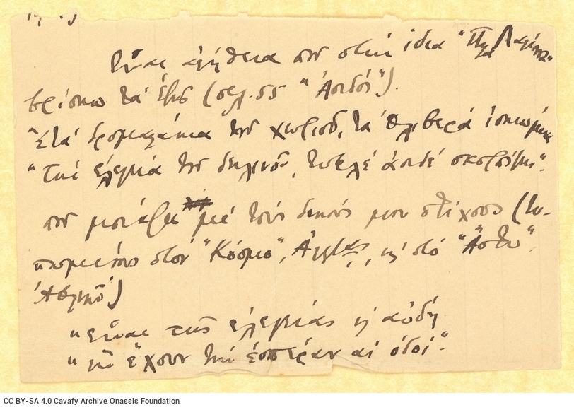 Cavafy, C. P.. “Note by Cavafy”. Notes (handwritten), n.d.. GR-OF CA CA-SF01-S03-F11-0084 (922), Onassis Foundation C. P. Cavafy Fonds. From The Digital Collection of the Cavafy Archive, edited by Onassis Foundation, Athens, last modified 01.10.2025. https://doi.org/10.26256/CA-SF01-S03-F11-0084.