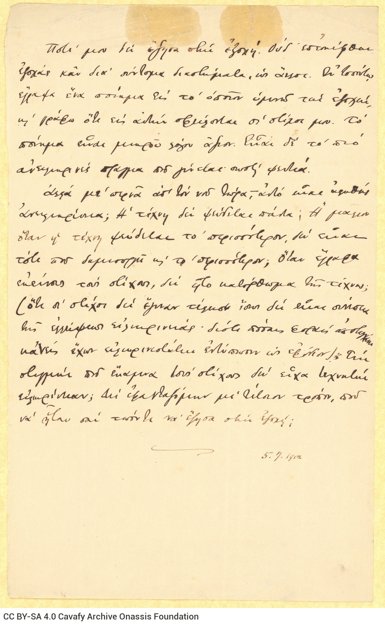 Cavafy, C. P.. “Note by Cavafy”. Notes (handwritten), 05.07.1902. GR-OF CA CA-SF01-S03-F09-0001 (196), Onassis Foundation C. P. Cavafy Fonds. From The Digital Collection of the Cavafy Archive, edited by Onassis Foundation, Athens, last modified 01.10.2025. https://doi.org/10.26256/CA-SF01-S03-F09-0001.