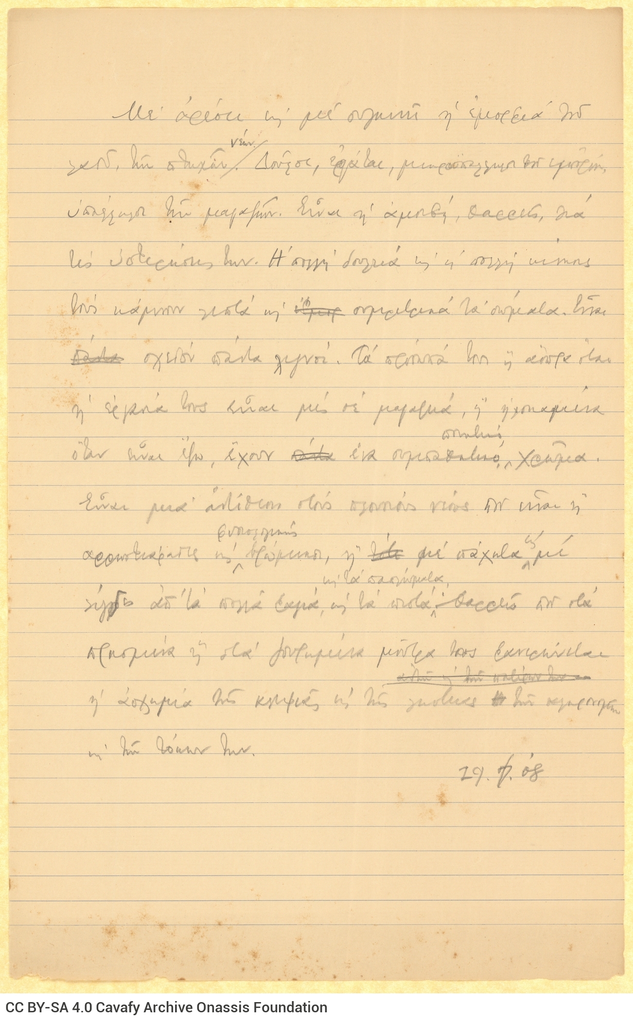 Cavafy, C. P.. “Note by Cavafy”. Notes (handwritten), 29.06.1908. GR-OF CA CA-SF01-S03-F09-0016 (207), Onassis Foundation C. P. Cavafy Fonds. From The Digital Collection of the Cavafy Archive, edited by Onassis Foundation, Athens, last modified 01.10.2025. https://doi.org/10.26256/CA-SF01-S03-F09-0016.