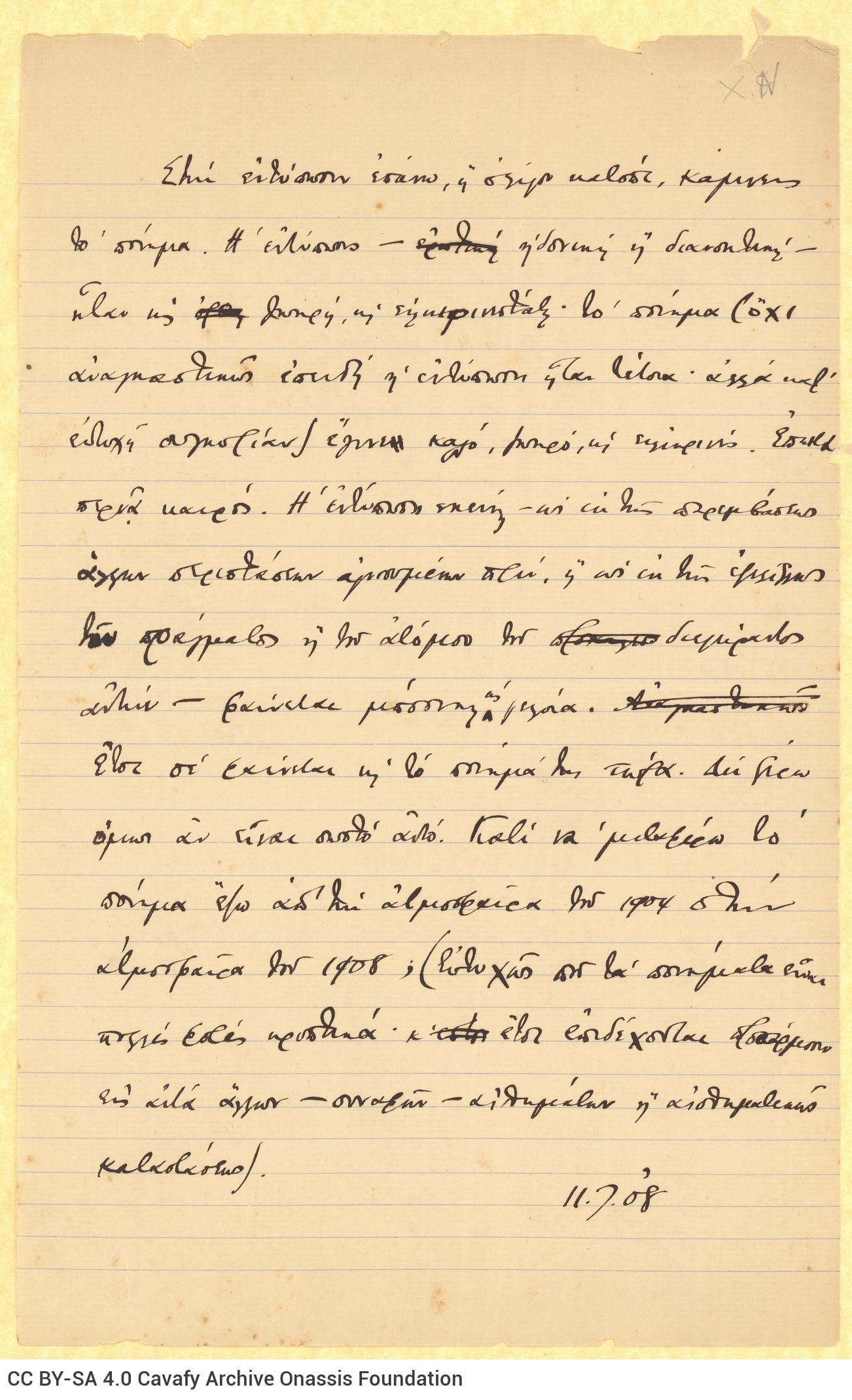 Cavafy, C. P.. “Note by Cavafy”. Notes (handwritten), 11.07.1908. GR-OF CA CA-SF01-S03-F09-0015 (208), Onassis Foundation C. P. Cavafy Fonds. From The Digital Collection of the Cavafy Archive, edited by Onassis Foundation, Athens, last modified 01.10.2025. https://doi.org/10.26256/CA-SF01-S03-F09-0015.
