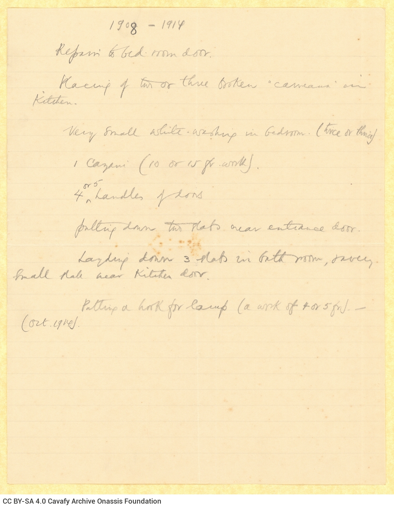 Handwritten note mentioning domestic repairs (bedroom, kitchen, lavatory, etc.), on the first page of a ruled bifolio. The remaining pages are blank. The indication "1908-1914" at the top of the first page. Amounts of money noted in two cases.