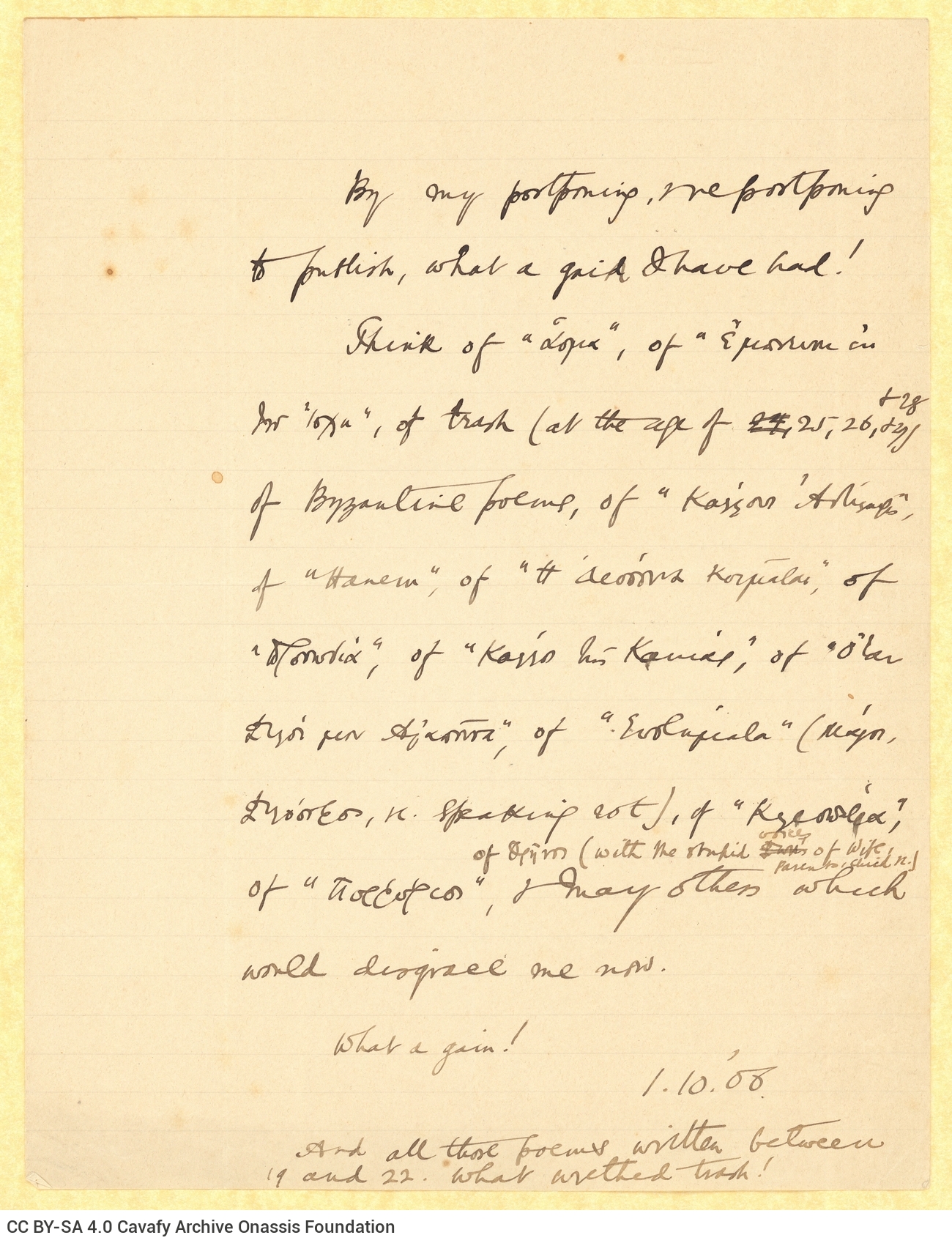 Aggressive note by Cavafy, in which he expresses his detest for poems of his youth, which remained unpublished. The titles referred to are the following: "Asma", "Empneusis ek tou Ischi", "Kallous antilipsis", "Harem", "I despoina koimatai", "Prosodia", "Kallos tis kakias", "Otan filoi mou agapousa", "Systimata", "Cleopatra", "Porphyrios", "Thrinos".