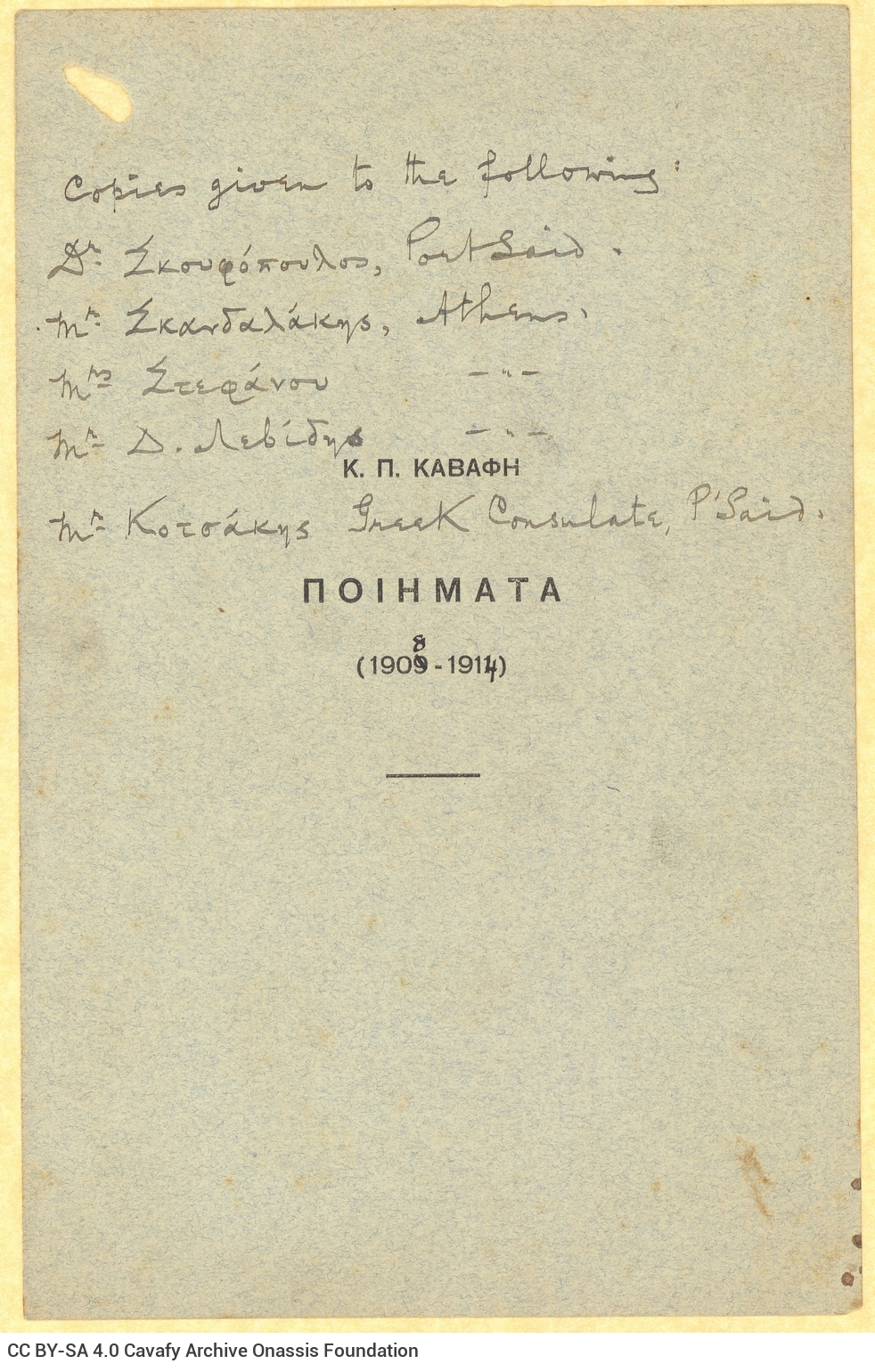 Handwritten note with names of recipients of copies, on a printed cover of a Cavafy poem Collection of the 1908-1914 period (the dates have been corrected in ink over the original 1909-1911). The handwriting is that of the poet's brother, John. Blank verso.