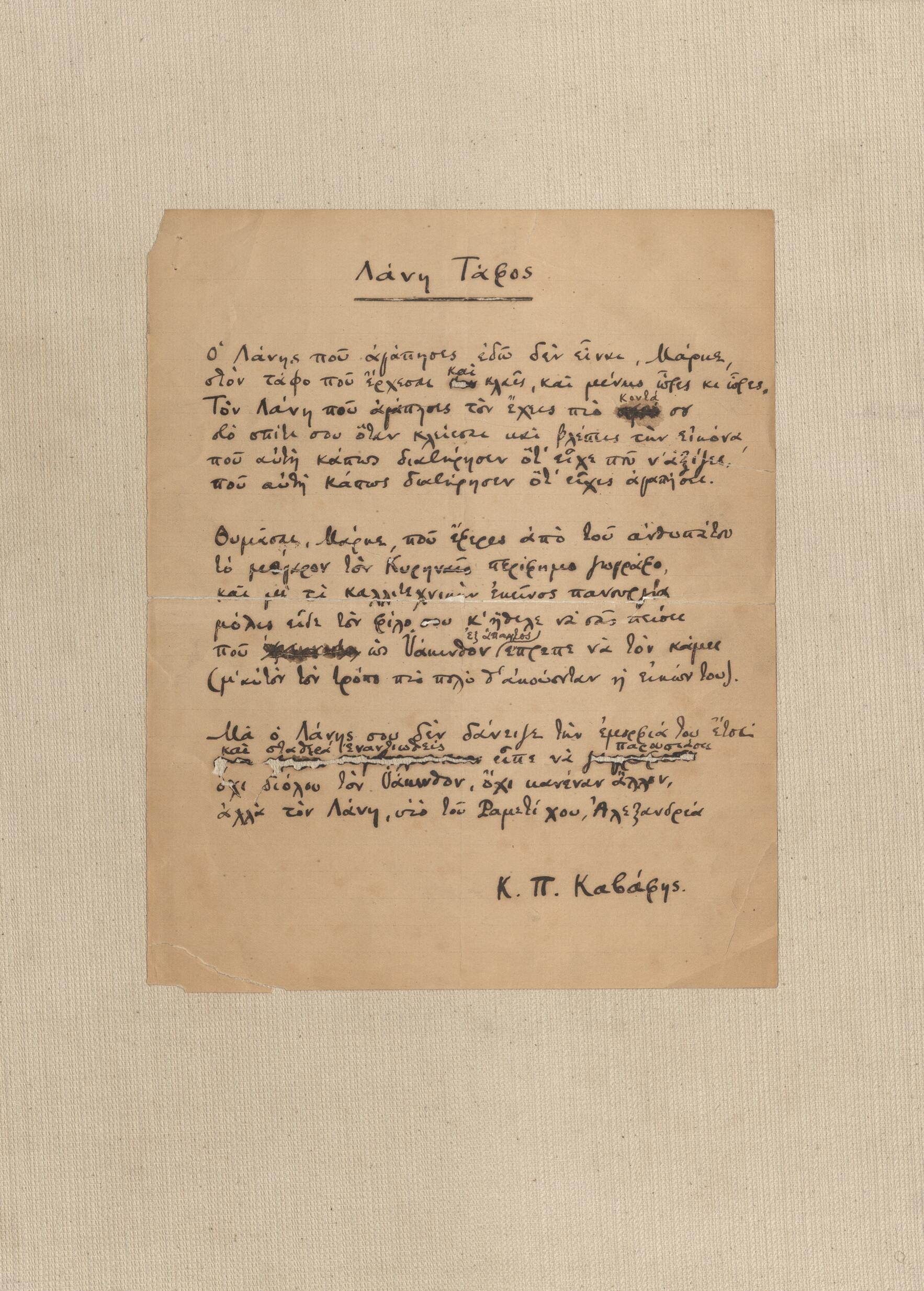 Handwritten note of the poem “Tomb of Lanes” with corrections and erasures in the body of the poem. Cavafy’s handwritten signature after the poem.