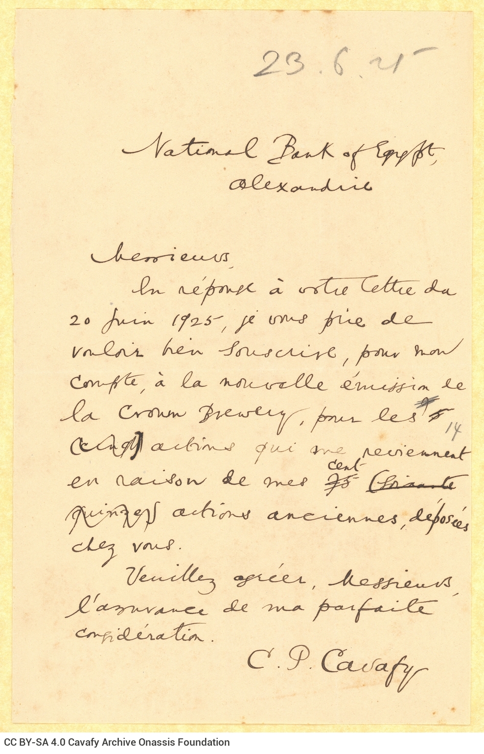 Καβάφης, Κ. Π., «Αντίγραφο επιστολής του Καβάφη προς την Εθνική Τράπεζα Αιγύπτου» (23.06.1925), Επιστολή (αντίγραφο), Αρχείο Κ. Π. Καβάφη του Ιδρύματος Ωνάση, GR-OF CA CA-SF02-S01-SS01-F17-SF003-0025 (1080), στο: Ψηφιακή Συλλογή του Αρχείου Καβάφη, επιμ. Ίδρυμα Ωνάση, Αθήνα, τελευταία ενημέρωση 01.10.2025: https://doi.org/10.26256/CA-SF02-S01-SS01-F17-SF003-0025.