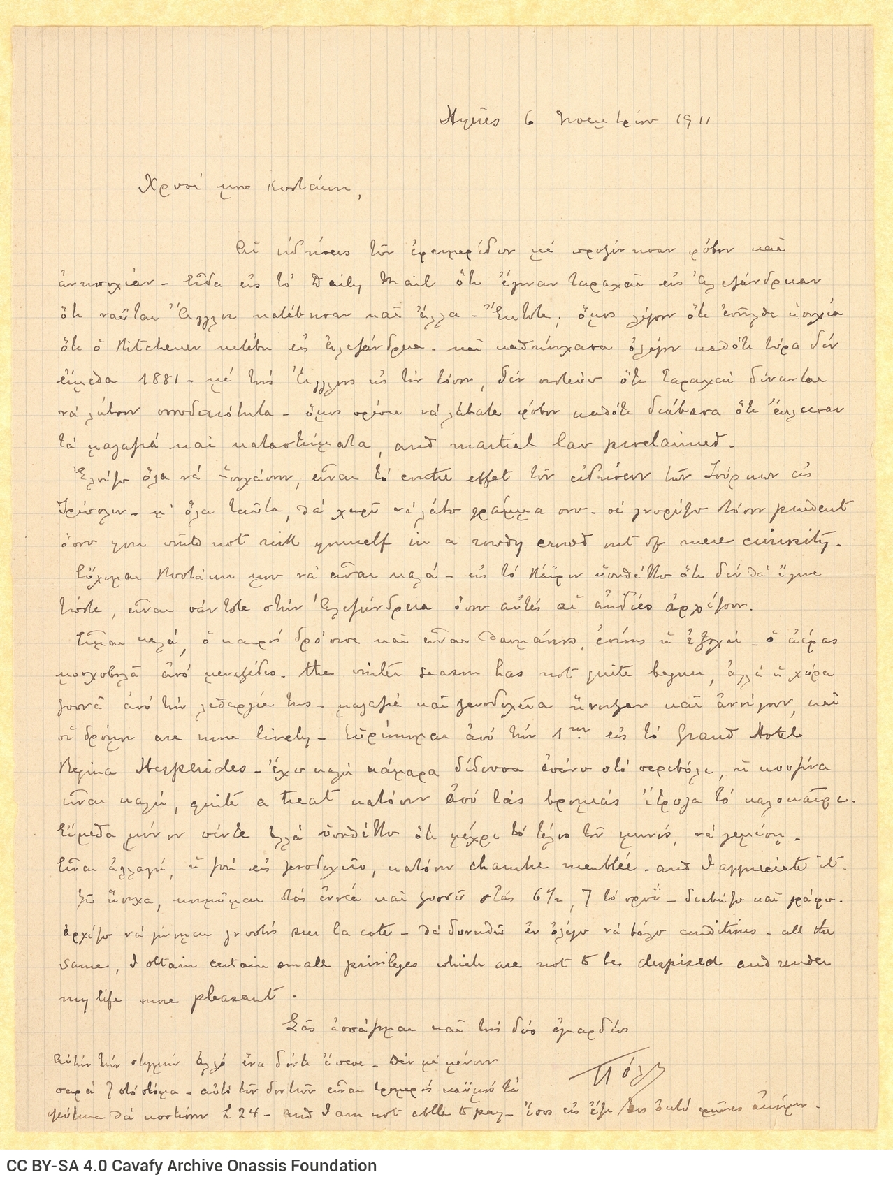 Καβάφης, Παύλος, «Επιστολή του Παύλου Καβάφη προς τον Κ. Π. Καβάφη» (06.11.1911), Επιστολή, Αρχείο Κ. Π. Καβάφη του Ιδρύματος Ωνάση, GR-OF CA CA-SF02-S01-SS02-F20-SF002-0041 (558), στο: Ψηφιακή Συλλογή του Αρχείου Καβάφη, επιμ. Ίδρυμα Ωνάση, Αθήνα, τελευταία ενημέρωση 01.10.2025: https://doi.org/10.26256/CA-SF02-S01-SS02-F20-SF002-0041.