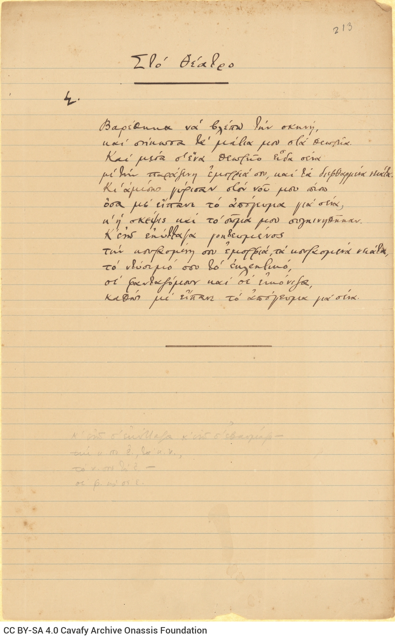 Manuscript of the poem "In the Theatre" and notes in the margin. The sheet number is marked ("213"). The note "S." between title and first verse.